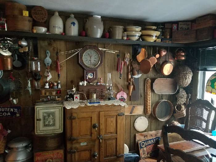 COUNTRY: Crocks, Butter Churns, Mixing Bowls, Copper Pans and Others, Utensils, Bread Boxes, Scales, Iron Fixtures…