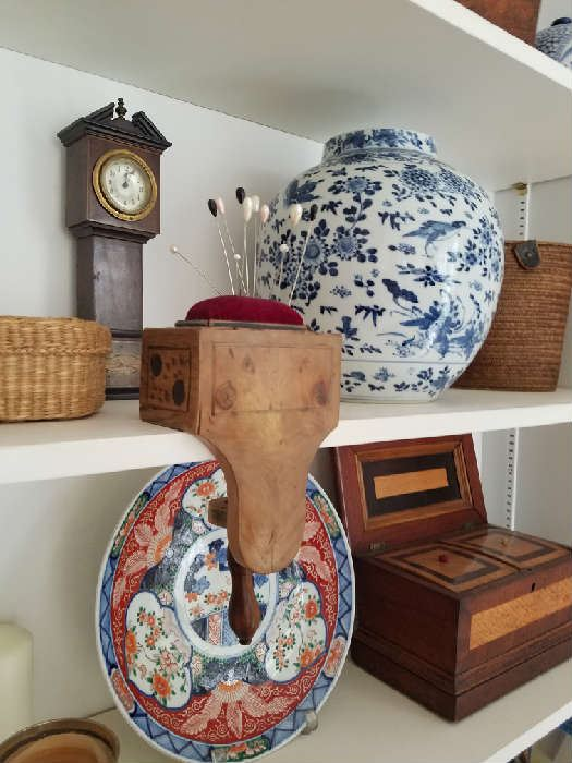 A fine collection of Asian Antiques. Porcelains, Bronzes, Figures etc. Including Large Blue and White Vase (19th c),Large Rose Medallion Punch Bowl with Terrific Stand, Antique 18″ Wooden Buddha, Pair antique wooden Fu Dog bookends, Export Plates and Bowls, Snuff Bottles, Framed Rank Badges, Wonderfully Framed Collage of Oriental Art