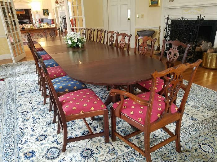 The dining room offers a very large triple pedestal Georgian style banded edge mahogany dining table. Along with a fine set of 16 Chippendale mahogany dining chairs (2 arms/14 sides) with great needlepoint seats featuring bees. As well as a Federal style mahogany sideboard.