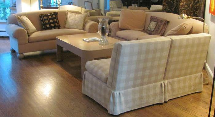 Decorator sofas and two fine linen wrapped coffee tables.