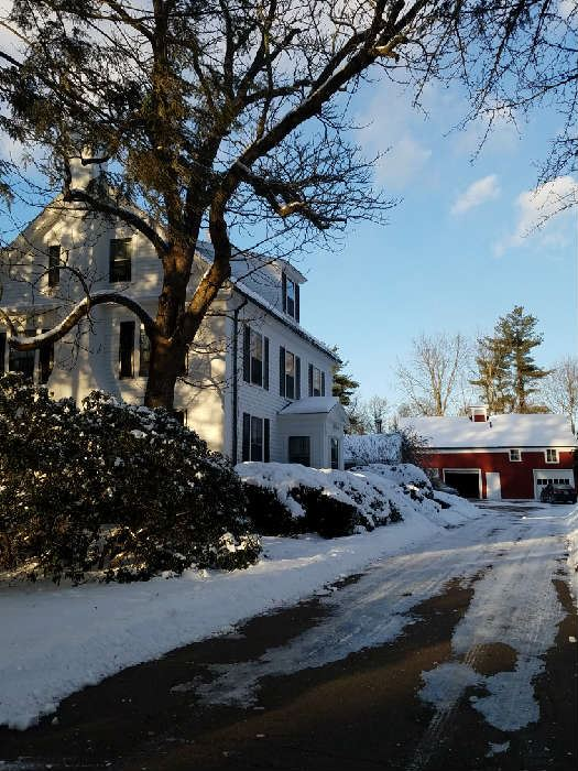A large antique home as well as large carriage house.