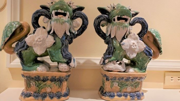 Asian: Fine pair of antique porcelain foo dogs, Selection of Rose Medallion including teapot and basket, cups, tray, plates and canisters. Pair of large Celadon foo dogs. Antique porcelain charger- “May your grandsons be distinguished”. Hexagonal shaped vase, Jade sculpture etc.