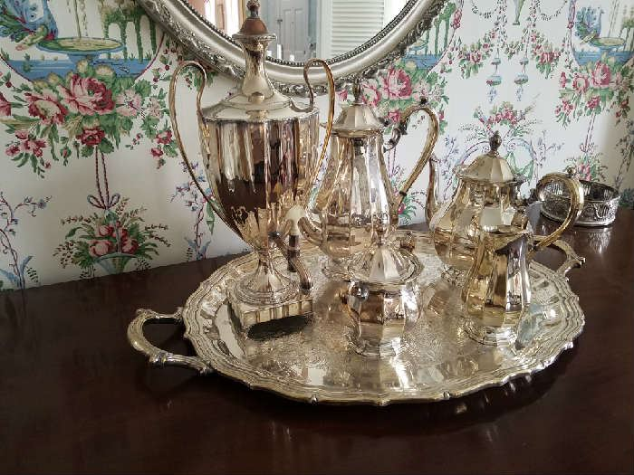 Pr of Gorham Triple Candlelabras. Fine Silver Plated Tea service.