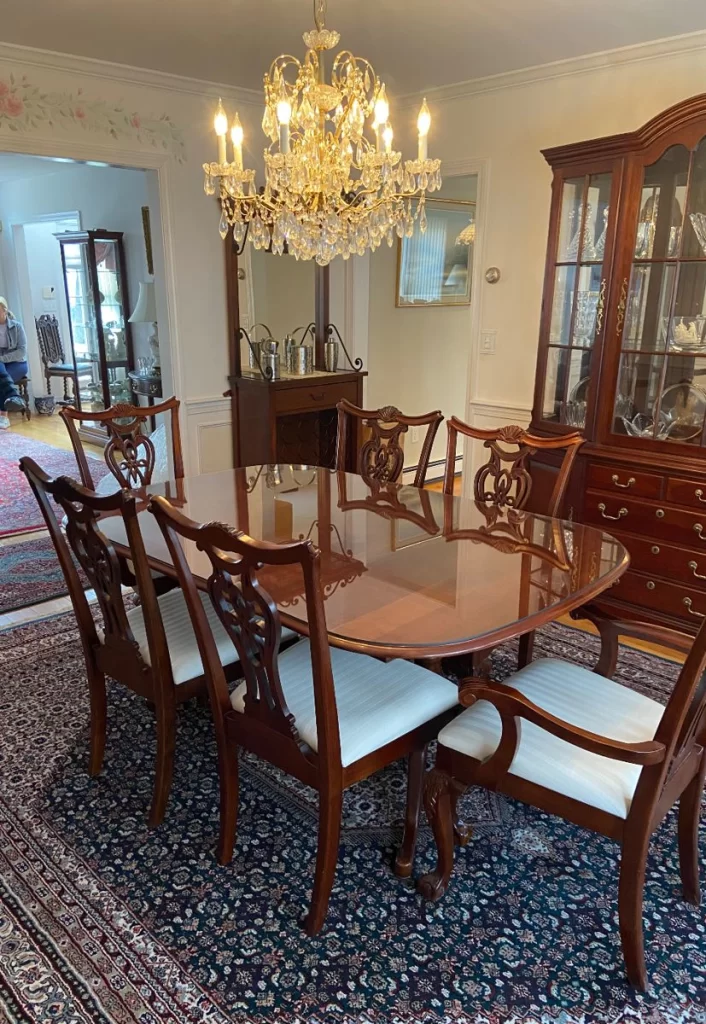FURNISHINGS: Exquisite Penn. House Dining Set like new and protected with custom glass top and leaves, 6 Chippendale style Dining Chairs, Several Penn. House and Howard Miller China Cabinets and Display Cases all high quality, Breakfront, Server, Splendid Howard Miller Wine/Bar Cabinet, End Table, Occasional Tables, Victorian corner Whatnot Shelf, Several Display End Tables, 4 “Black Forest” Carved Chairs, Marble top candle Stand, White Bedroom Set, King Size Bed, Gorgeous fan carved Tall Boy, Upholstered Chairs, Desks, 2 Pristine Bowed front oak Cabinets, Lowboy, Cheval Looking Mirror, Grandfather clock…