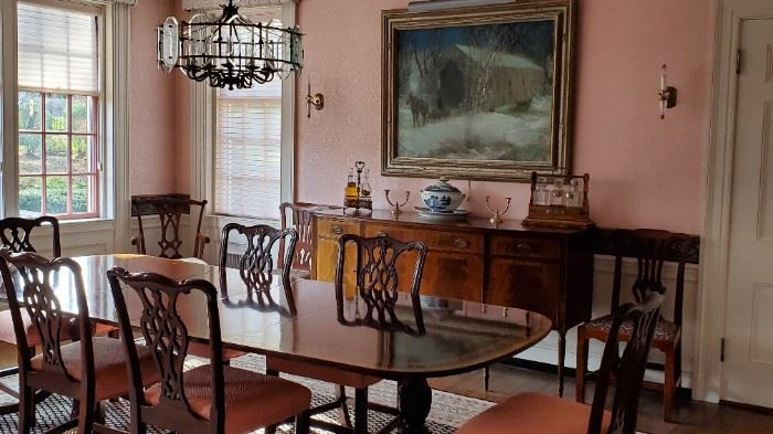table with 6 Chippendale dining chairs made by Council. Several other sets of chairs.