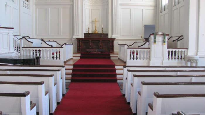 The sale will include the Sanctuary. All Church pews including Gothic influenced examples with walnut rails (approximately 60), ornate Vermont marble Baptismal Font, Mahogany Altar piece with free standing columnar supports and book matched famed mahogany veneered panels along with gold leaf ornamentation, exceptional Georgian influenced Architrave with pineapple finial, dental moldings, Corinthian capitals , fluted pilasters and concave shell design, approximately 12 feet tall; An assortment of finely crafted raised panel mahogany finished doors including ten, eight and four panel examples (some having arched tops) along with corresponding millwork surrounding doors; Grand Piano. Extensive Lighting including twelve pewter Queen Anne style multi armed and multi-tiered chandeliers with cut frosted shades, Windows and Window Treatments.